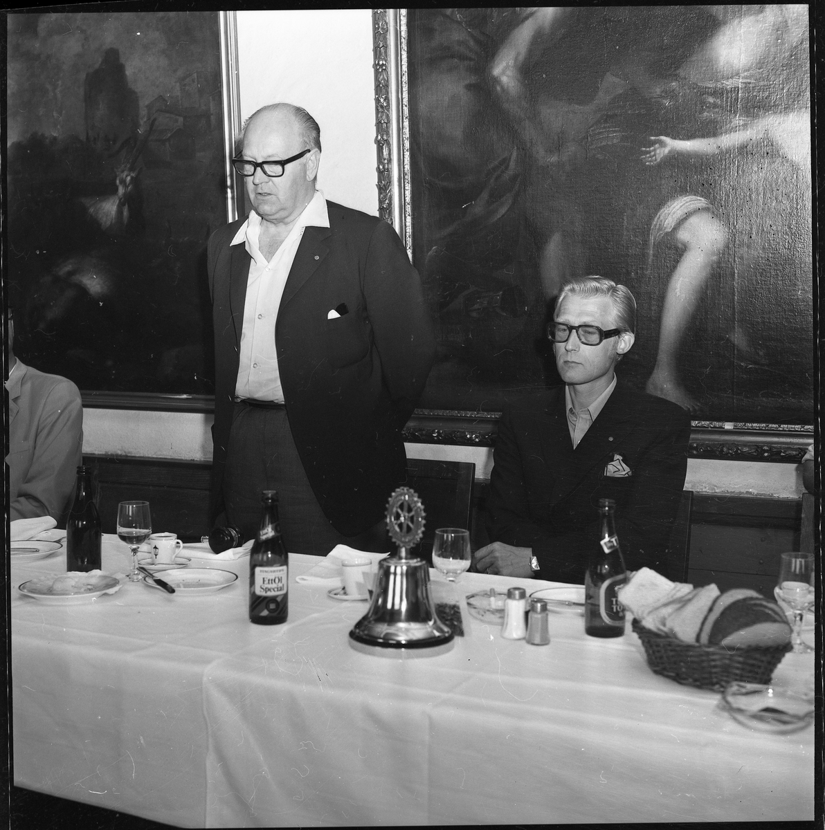En man står upp vid ett matbord och håller sannolikt ett tal. På bordet en "Rotary-klocka", kaffekoppar, glas och ölflaskor. Han flankeras av sittande män.