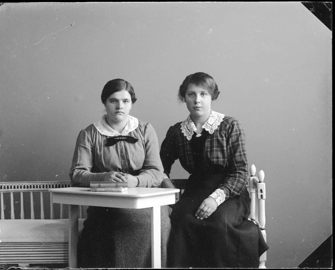 Porträtt av två unga kvinnor som sitter i en soffa vid ett litet bord.