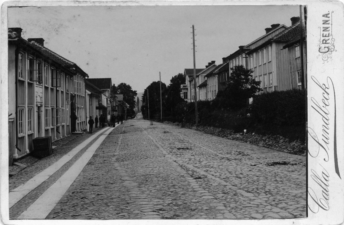 Brahegatan från Söder tull och norrut. Kvarteren Greven till vänster och Föreningen till höger. Kyrkan till höger saknas, alltså efter branden 1889.