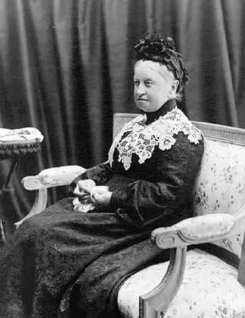 Porträtt av en sittande äldre kvinna i mörk mönstrad klänning och vit lös spetskrage. Hon sitter in en blommönstrad soffa av gustaviansk stil och håller möjligen en näsduk i händerna.