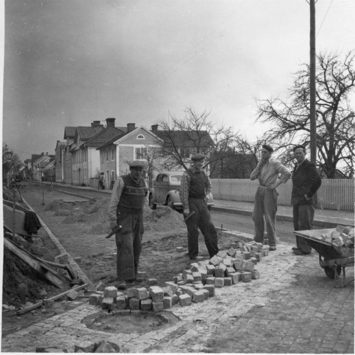Fyra män arbetar med stensättning av norra delen av Brahegatan i Gränna. Gatan har breddats.