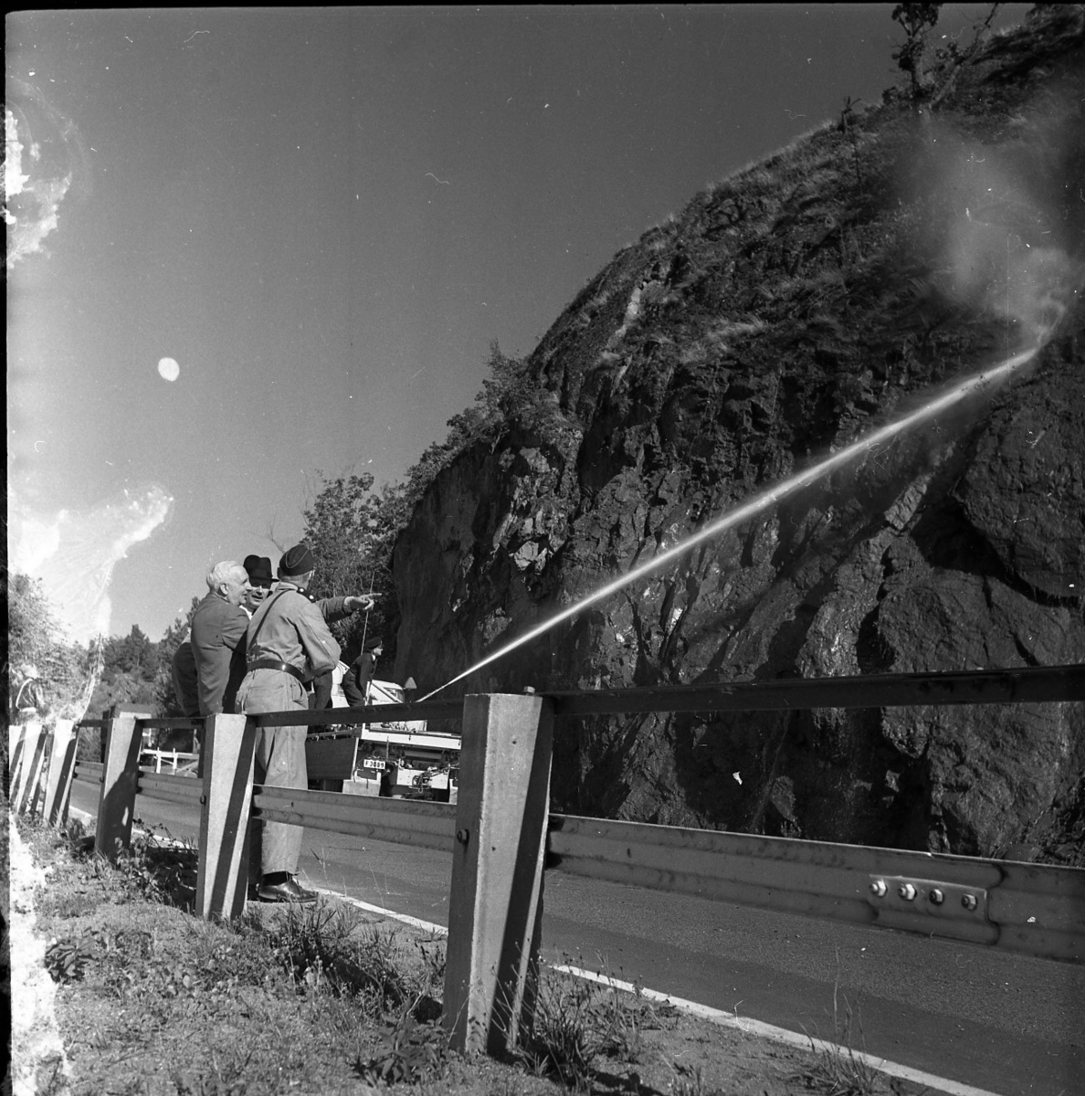Rasberget vid länsgränsen 1961. En vattenkanon åker längst med en motorväg och har kanonen riktad mot en bergvägg. Vattnet träffar högt upp på berget och nedanför ligger rasmassor. Mot vägstaketet står tre herrar lutade, en av dem är polis.