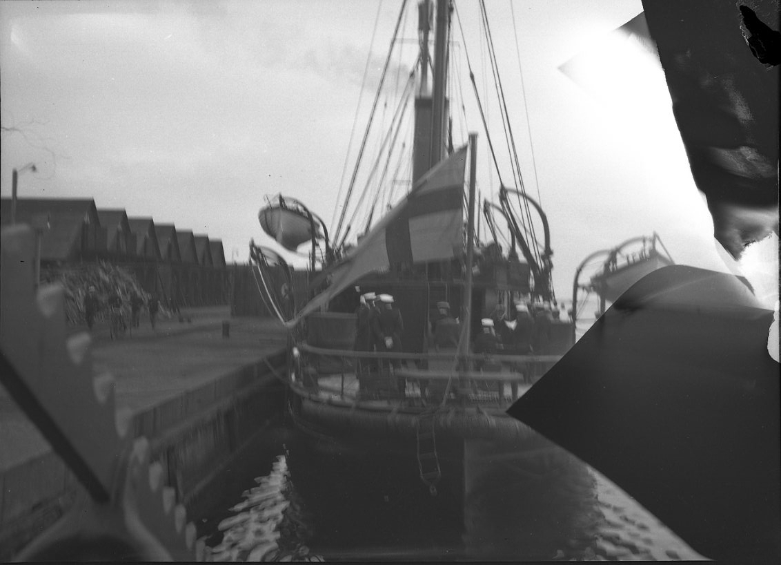 Kanonbåten HMS Svensksund vid kaj. Örlogsflaggan är hissad i aktern, där det också står ett antal officerare.