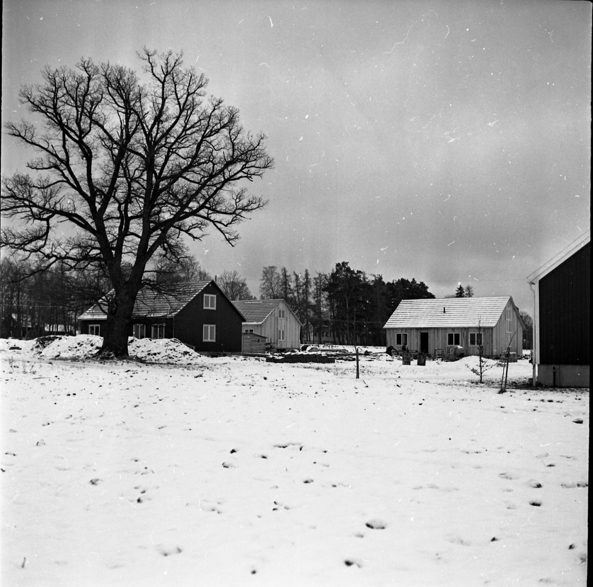 Ett nästan färdigbyggt hus syns på avstånd. Det ligger snö på marken.