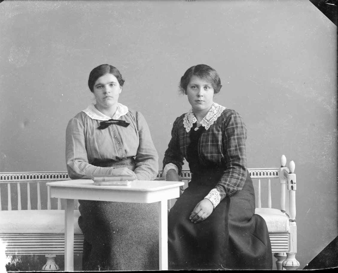 Porträtt av två unga kvinnor som sitter i en soffa vid ett litet bord.