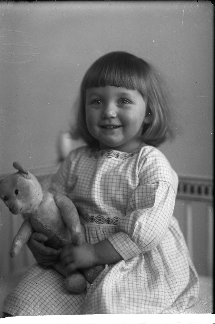 Porträtt av en liten flicka som sitter i en soffa. Hon bär en rutig klänning och håller en nalle i händerna.