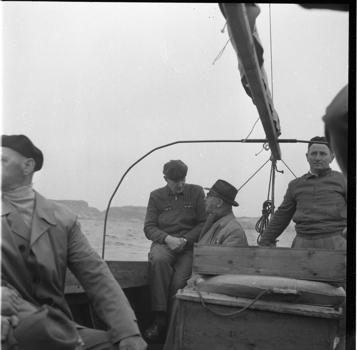 Fyra män i en segelbåt med inombordare. Mannen i hatt och ljus rock i aktern är troligen Osse Gustafsson.