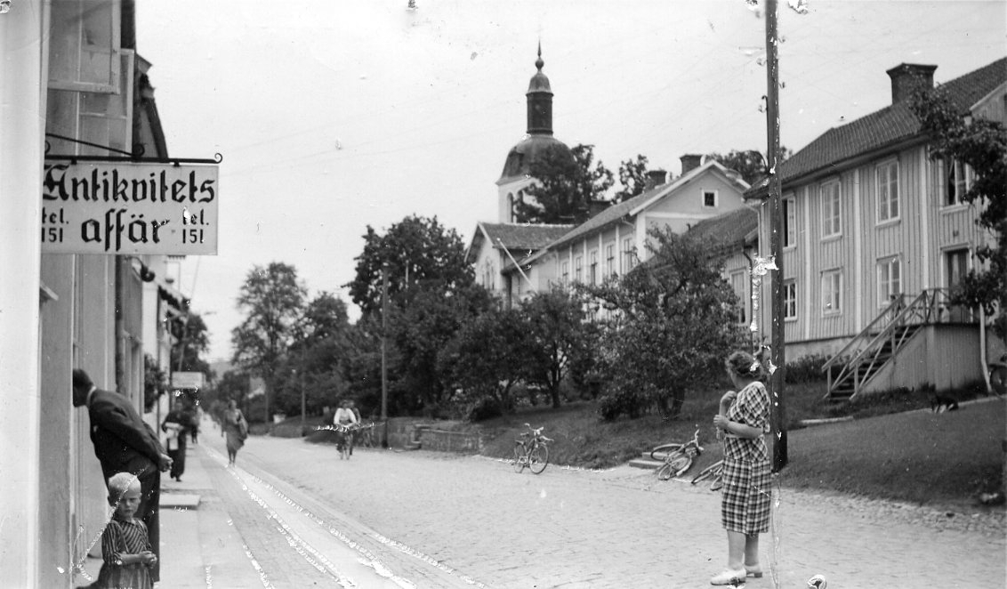 Brahegatan från söder mot norr. Två cyklister kommer åkande i riktning mot fotografen. En kvinna står på gatan och tittar norrut. En man står böjd och kikar i ett skyltfönster till "Antikvitetsaffär" till vänster. En liten pojke står hitom honom och tittar på fotografen. Några cyklar ligger i slänten på högra sidan av gatan.
