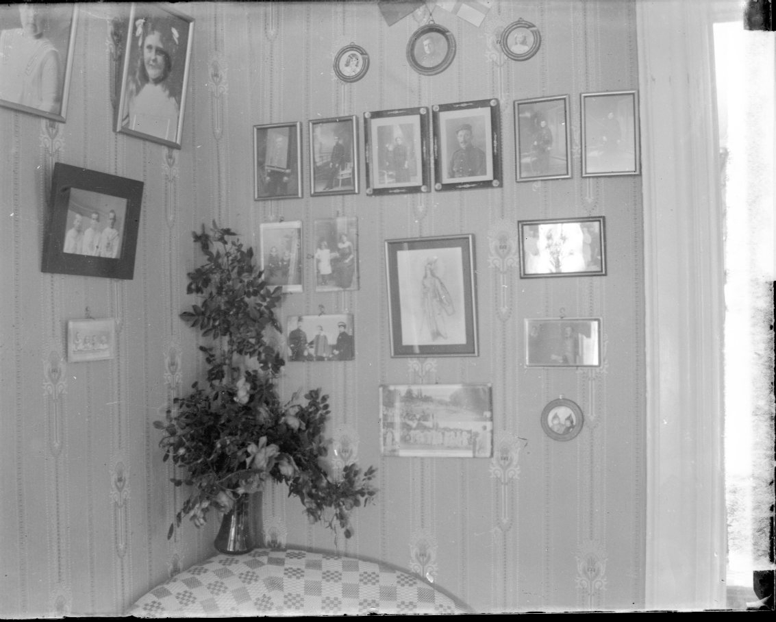 En hemmiljö. Ett vägghörn med ett stort antal fotografier på väggen.