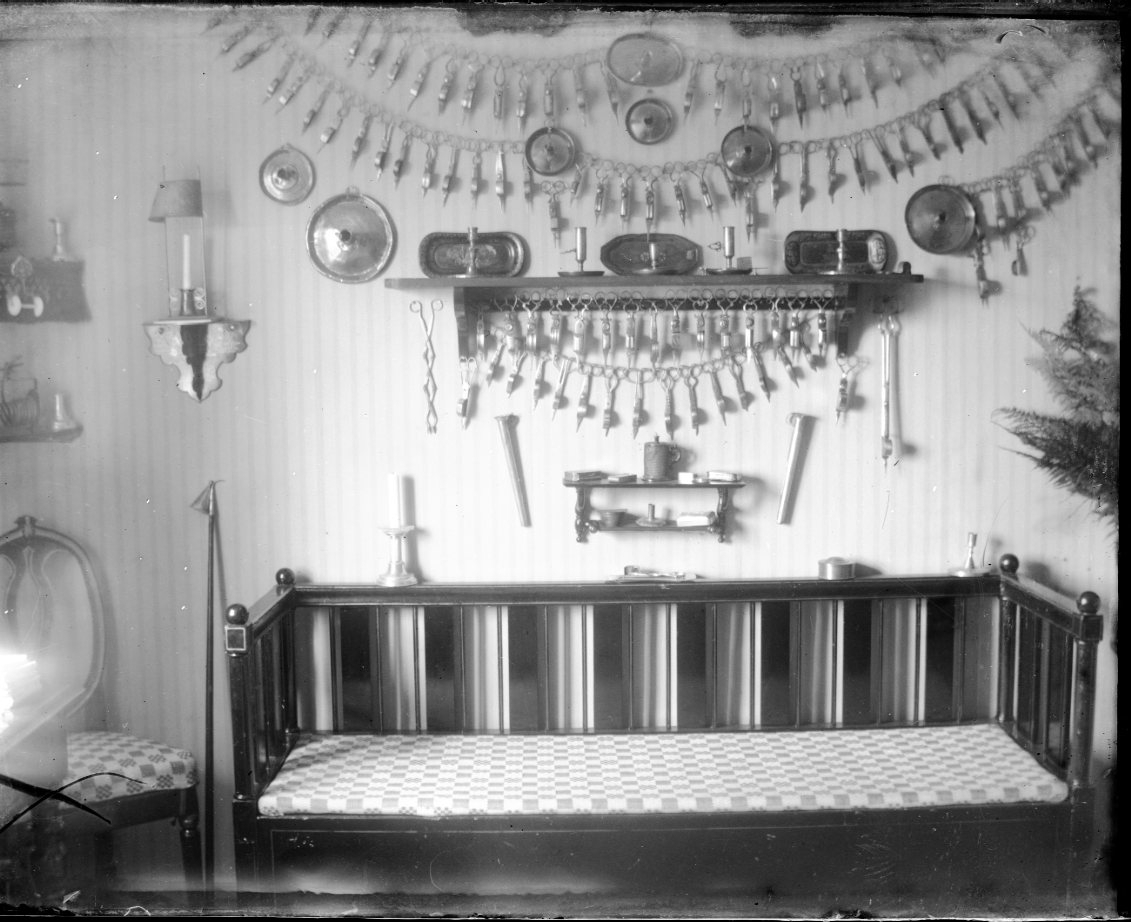 En hemmiljö. Ett stort antal ljussaxar hänger i bågformar på en vägg ovanför ett soffa med rutigt tyg.