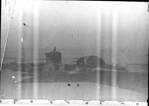 Oretuscherad. Ballongen Örnens landningsplats. Möjligen S A Andrée till vänster vid en kälke och Knut Fraenkel till höger vid bärringen. Unionsflaggan uppsatt på gondolen. Påminner om gm.II-32.