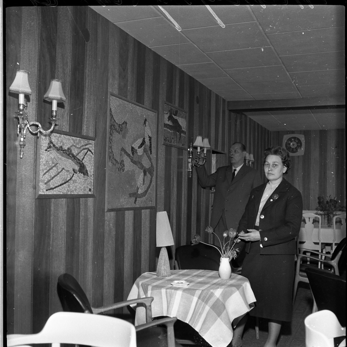 Ägarna, herr och fru Madsen i Ribbagårdens "mahogny-sal". Lauritz Madsen pysslar med väggarmaturen.