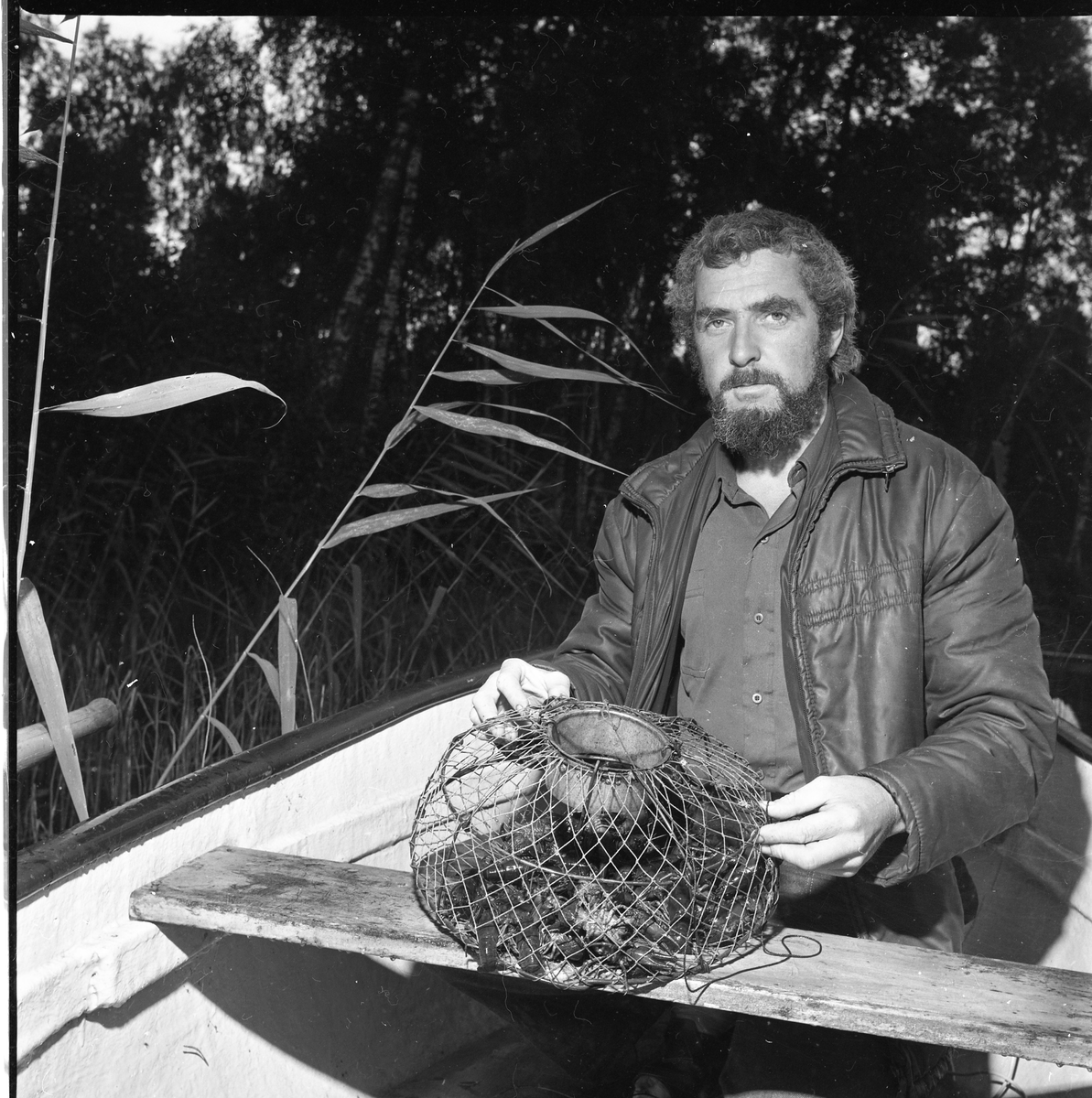 En man med skägg och jacka sitter i en roddbåt men en kräftbur i händerna.