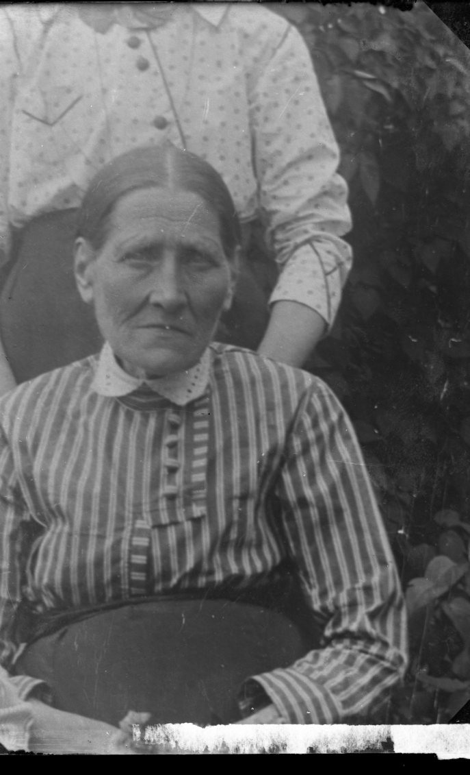 Porträtt av en äldre kvinna i randigt livstycke. Beskuren bild.