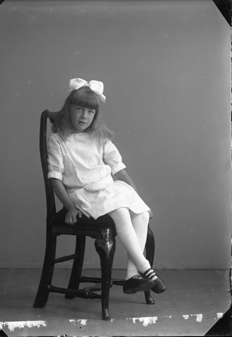 En liten flicka i vit klänning, vita strumpor och vit rosett i håret sitter på en stol.