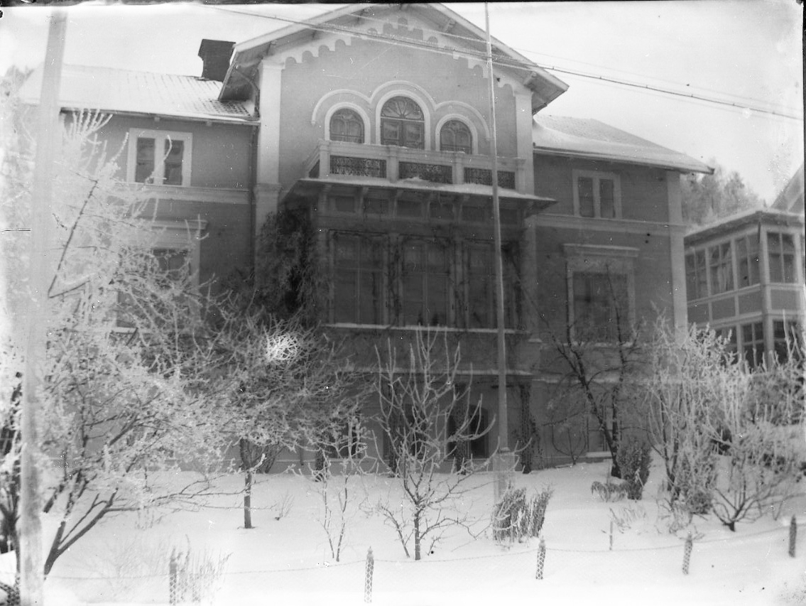 En större fastighet utmed Brahegatan i Gränna omgiven av snö. Den så kallade von Otterska villan.