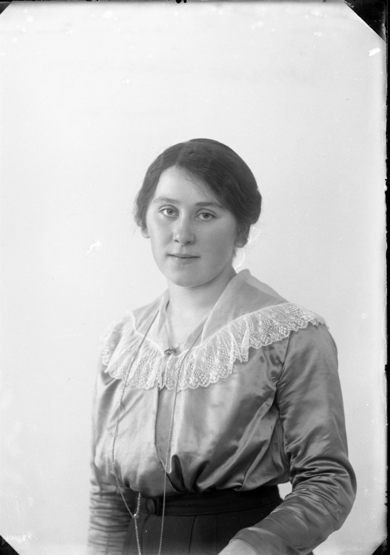 Porträtt av en ung kvinna i mörk kjol och ljust livstycke med bred, tunn, vit spetskrage.