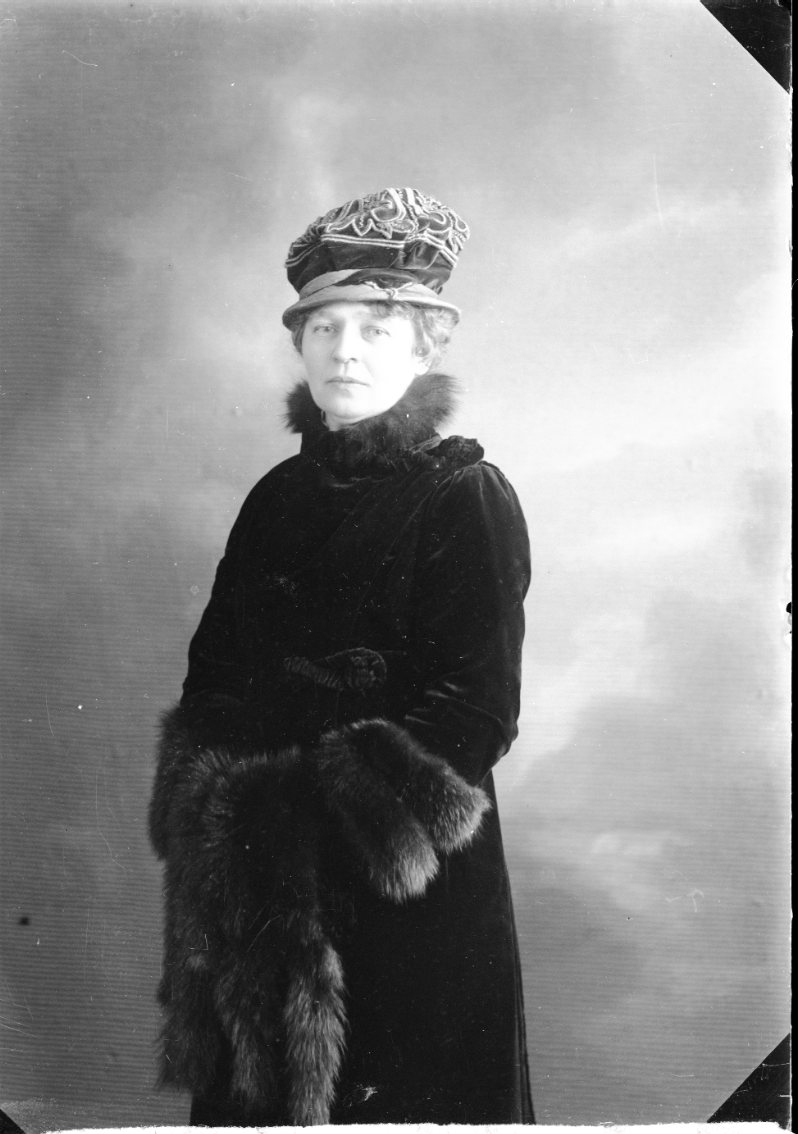 Porträtt av en kvinna i mörka ytterkläder, boa och hatt.