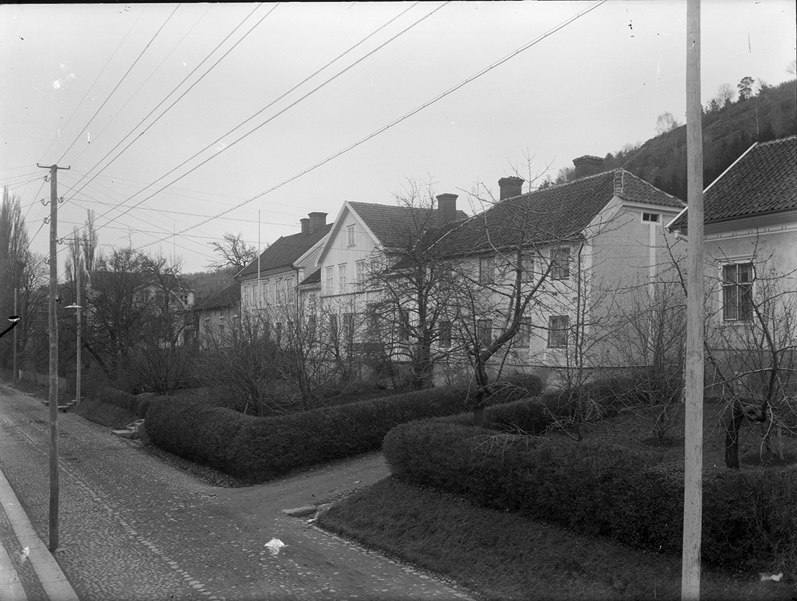 Brahegatan i Gränna. Gatan är kullerstensbelagd samt dubbla rader borgmästarsten på västra sidan. Trädgårdar och bebyggelse på östra sidan.