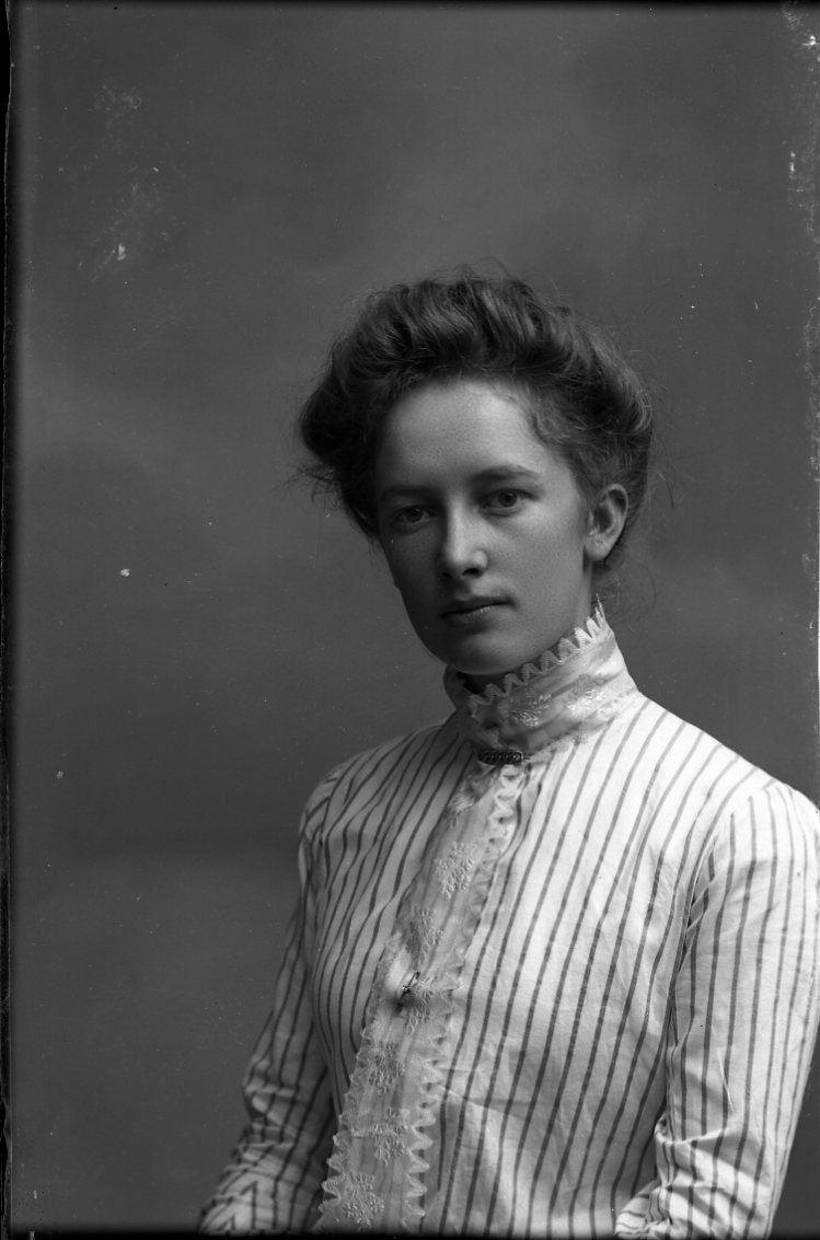 Porträtt en ung kvinna med uppsatt hår. Randig blus med hög krage och krås.
