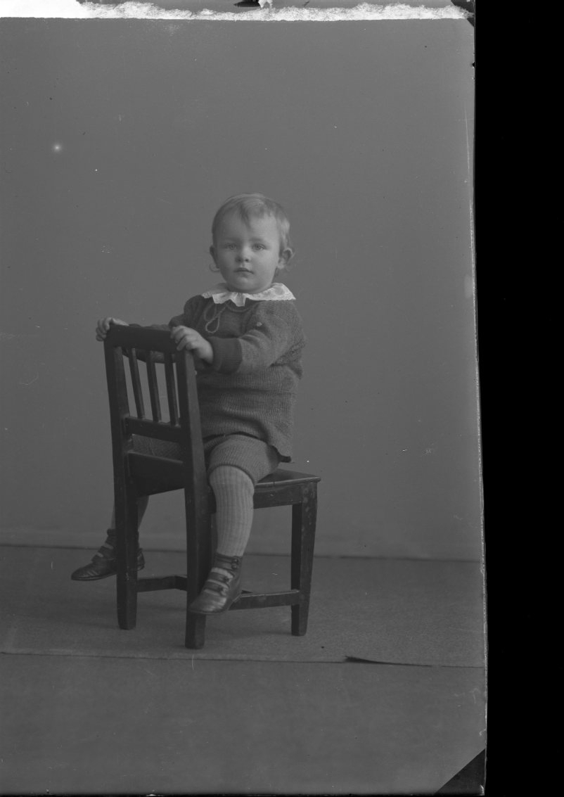 Porträtt av en liten pojke som sitter bak-och-fram på en barnstol.
