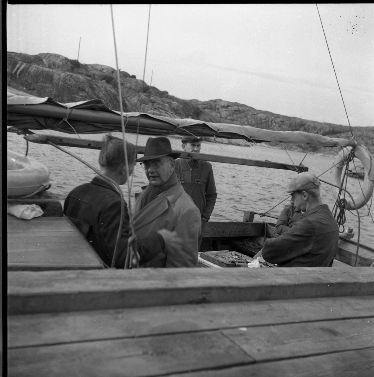 Fem män i en träbåt med mast och inombordare som ligger vid en brygga. En man i hatt och ljus rock är möjligen Osse Gustafsson.