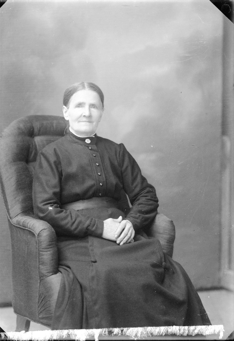 Porträtt av en äldre kvinna i mörk klänning som sitter i en fåtölj.