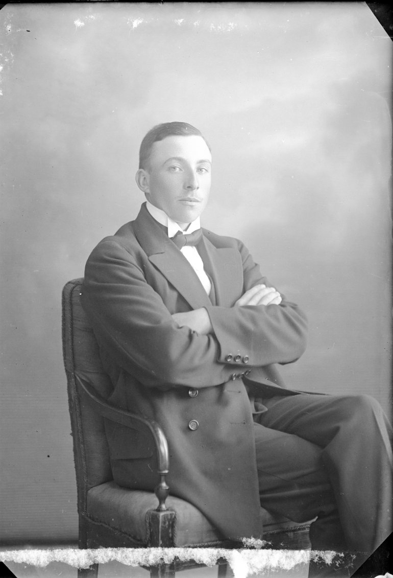 En mustaschprydd ung man i kostym och fluga sitter i en stol med armarna i kors.
