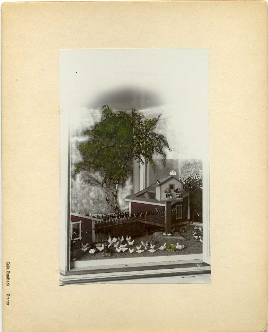 Fotografi av Fredrik Hård af Segerstads diorama med skulpterade figurer från livet på landet i Reaby: "Biologi i skulptur". I dioramat syns bland annat hästar, fåglar och fjäderfä. Färglagt fotografi.