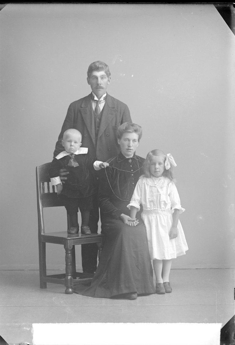 Gruppbild med en man, en kvinna, en flicka och en liten pojke som står på en stol