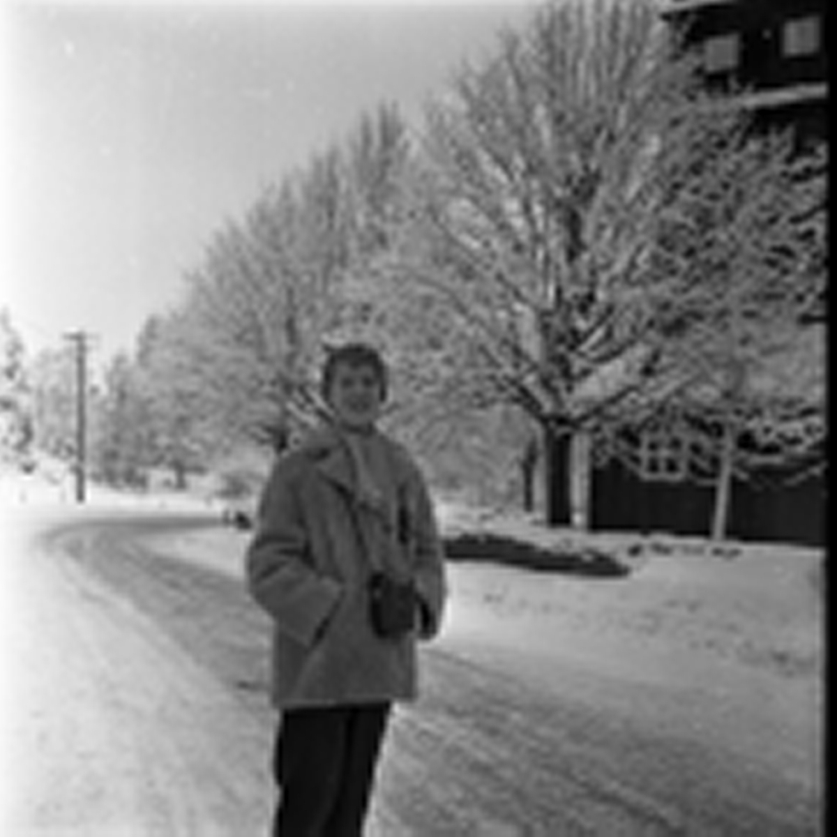 En kvinna står och ler in i kameran. Det är vinter, det är ordentligt med snö och kvinna är vinterklädd. Hon har en kamera hängade på magen. I bakgrunden skymtar ett rött hus.