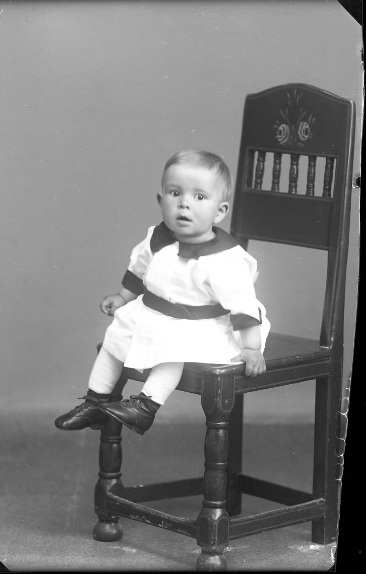Porträtt av ett litet barn i 1-årsåldern som sitter på en stol.