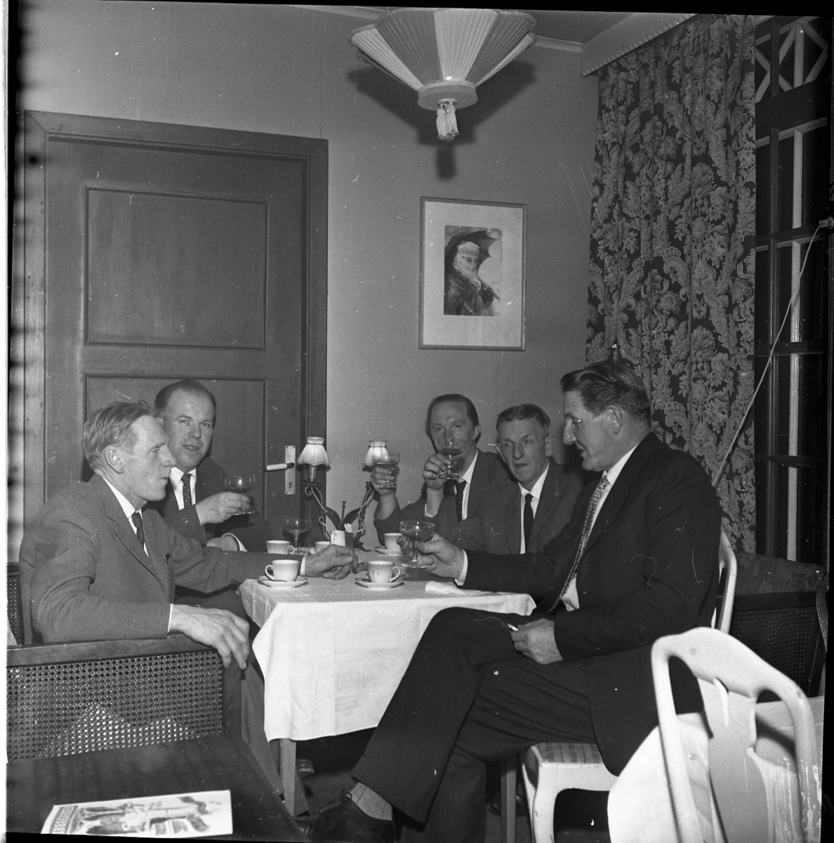 Fem män sitter och dricker kaffe och röker. De har taklagsfest. De höjer sina glas i en skål.