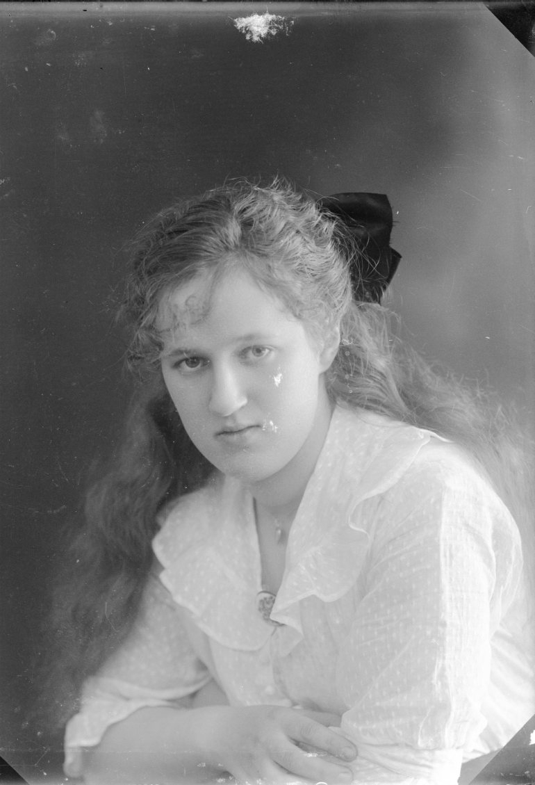 Bröstbild av en flicka i tunn prickig blus. Rosett i håret.
