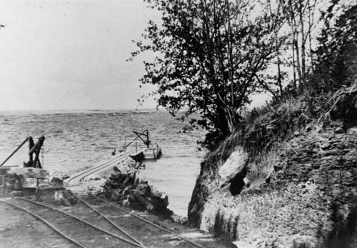 Två rälsspår leder ut till mindre bryggor med vinschar.