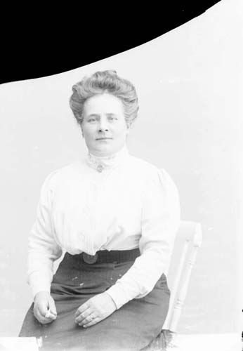 Porträtt av en kvinna som sitter på en pinnstol. Klädd i ljus blus och mörk kjol.