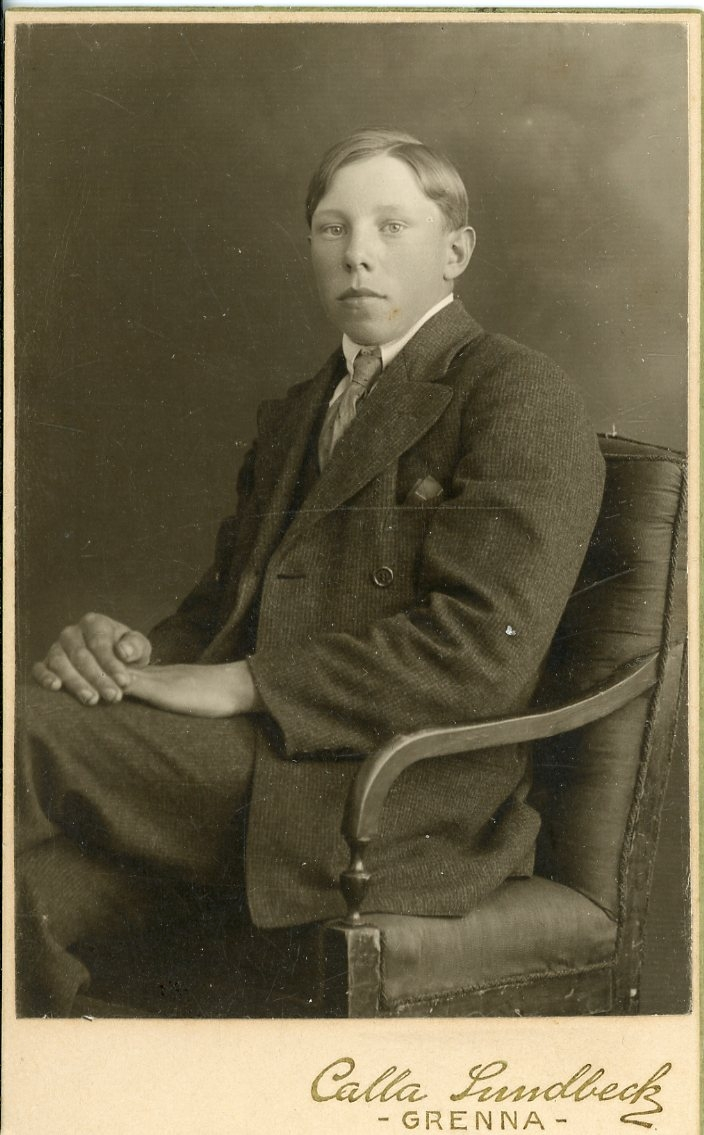 Porträtt av en pojke i tonåren som sitter i en fåtölj.