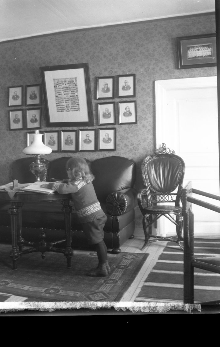 En liten pojke står i ett rum vid ett bord och en skinnsoffa. På väggen hänger ett stort antal porträtt på präster.