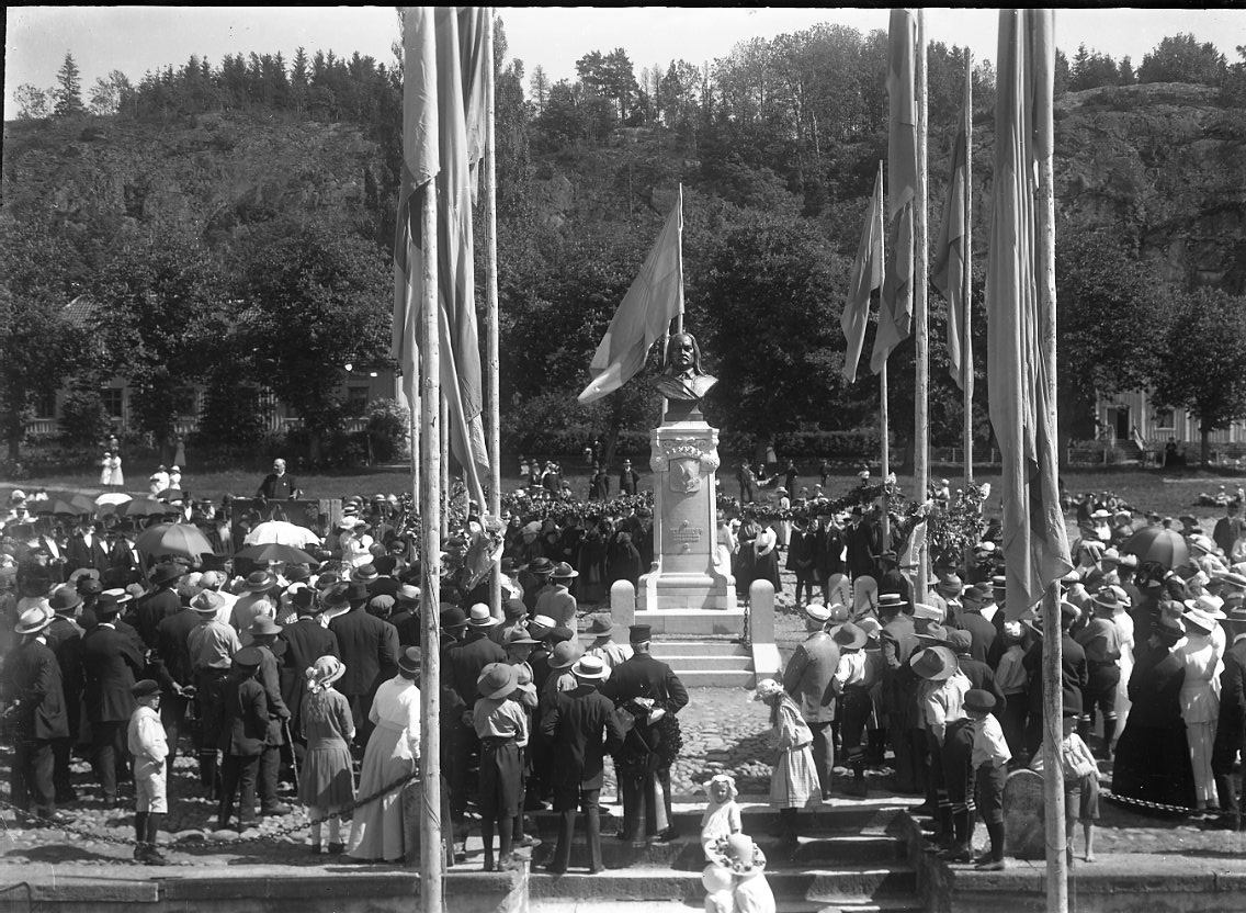 Fotografi i samband med invigningen av Per Brahe-bysten på Gränna torg 1916. En folksamling kring bysten och en talarstol med en man till vänster om densamma. Flaggor kantar vägen från Brahegatan upp mot bysten.