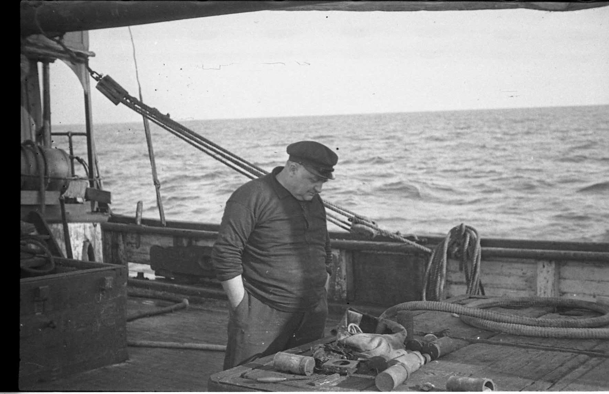Kocken Håkon Myhre med Vitöfynd ombord på Isbjörn: fotografisk utrustning med bl a burkar för film.