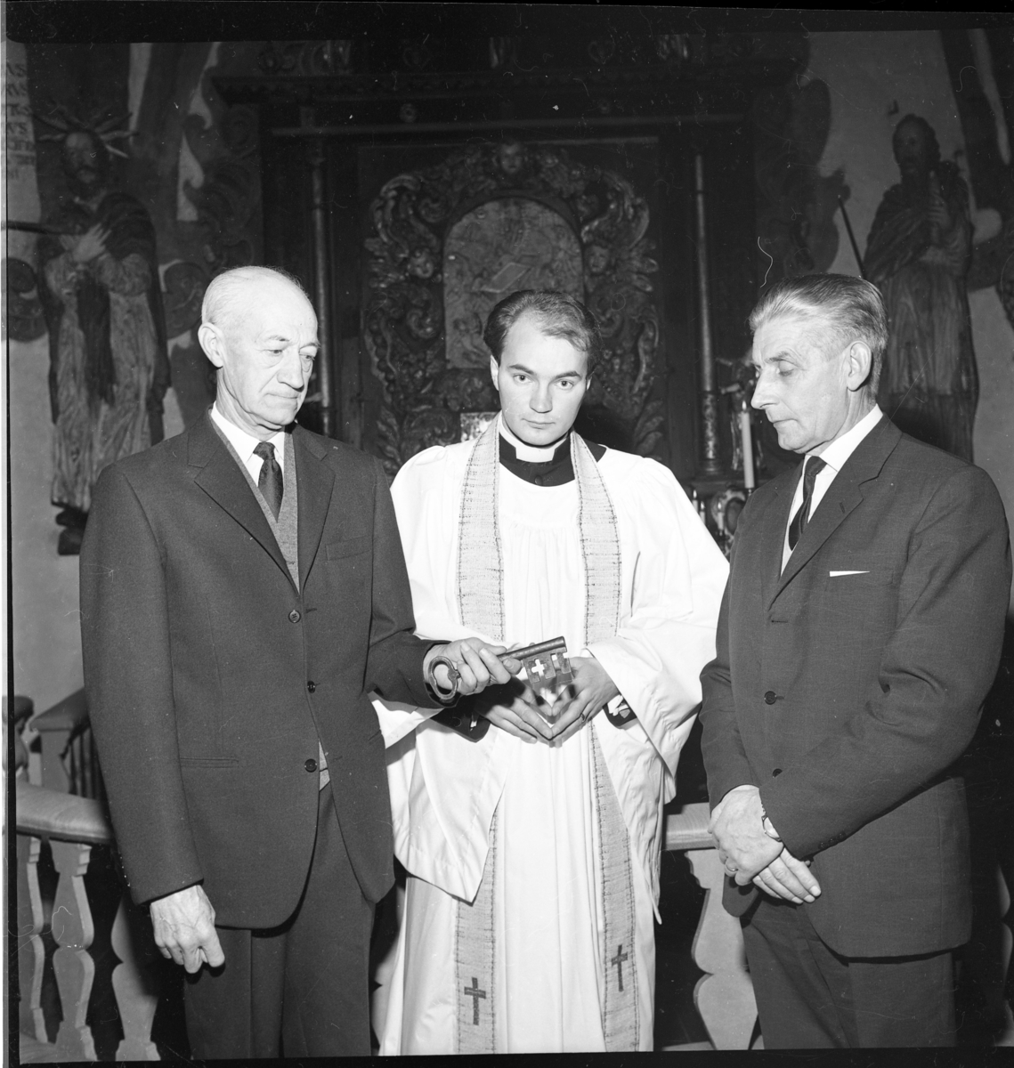 Två män i kostym flankerar pastor Leif Norrgård i Brahekyrkan, Visingsö. Mannen till vänster är avgående kyrkvaktmästare i Brahekyrkan, Ture Johansson, som överlämnar nyckeln till tillträdande kyrkvaktmästaren David Linder.