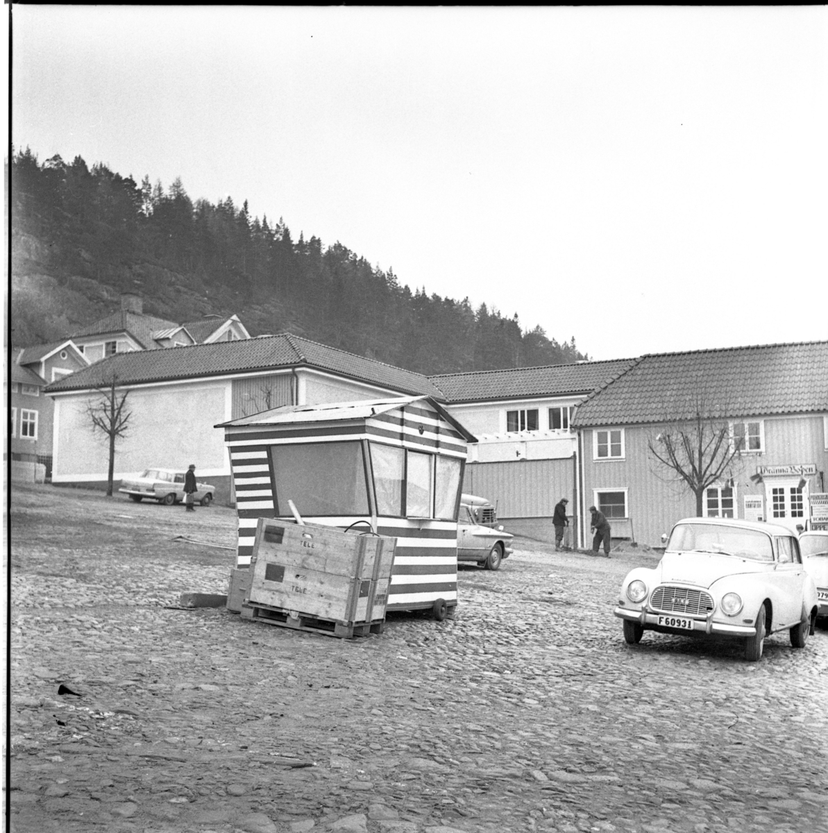 En randig liten kiosk står placerad på Gränna torg, i bakgrunden Medborgargården i Gränna.