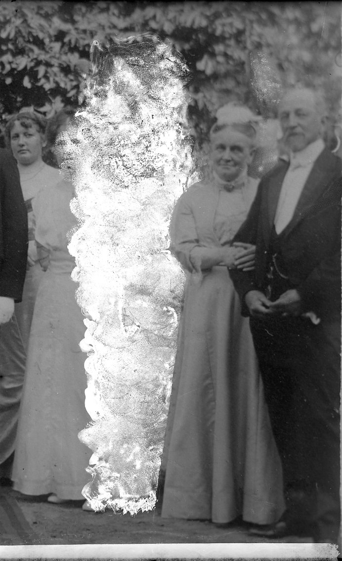 Del av en man samt två unga kvinnor till vänster. Till höger ett äldre par. Mellan dem en retuschering.
