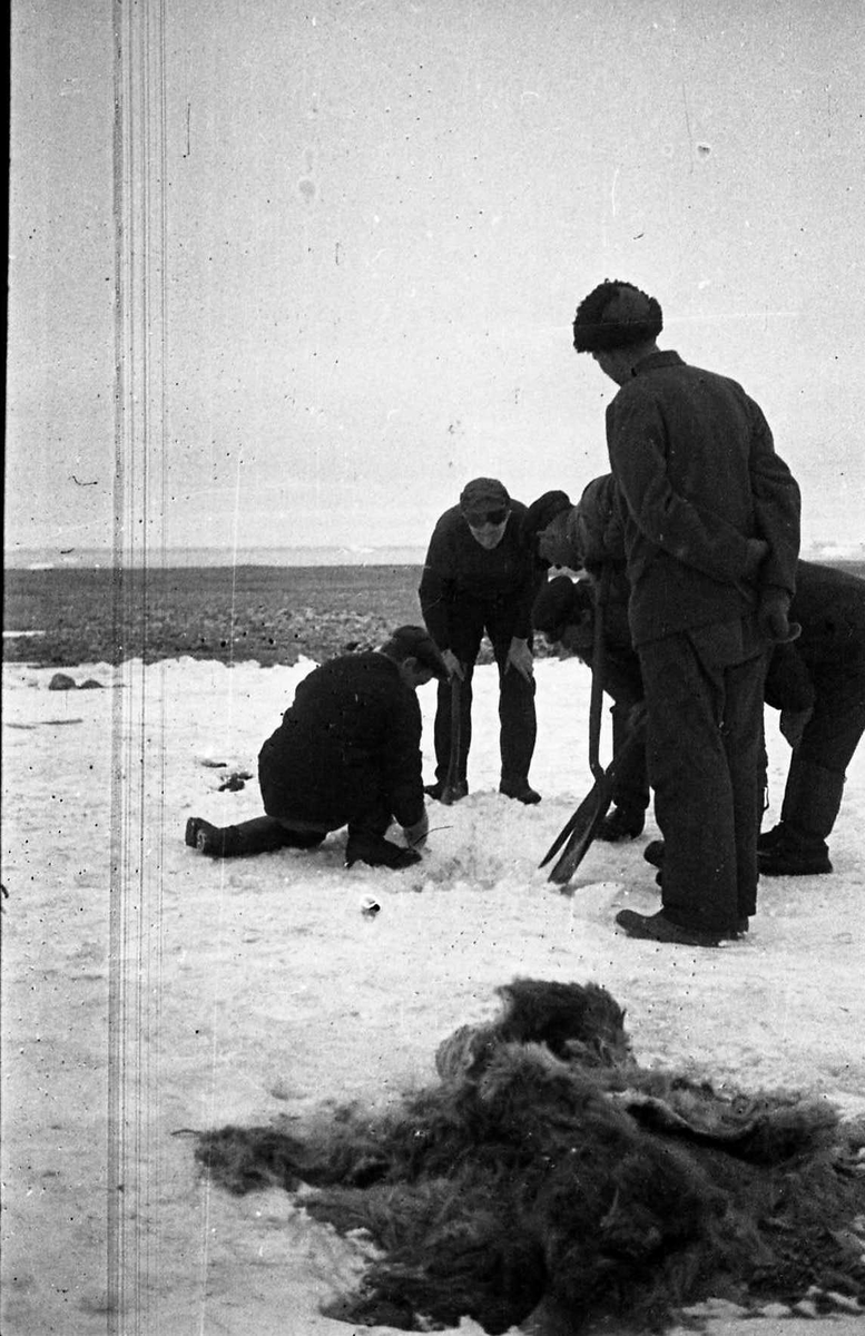 Besättningsmän från Isbjörn vid utgrävning av Andréelägret på Vitön.