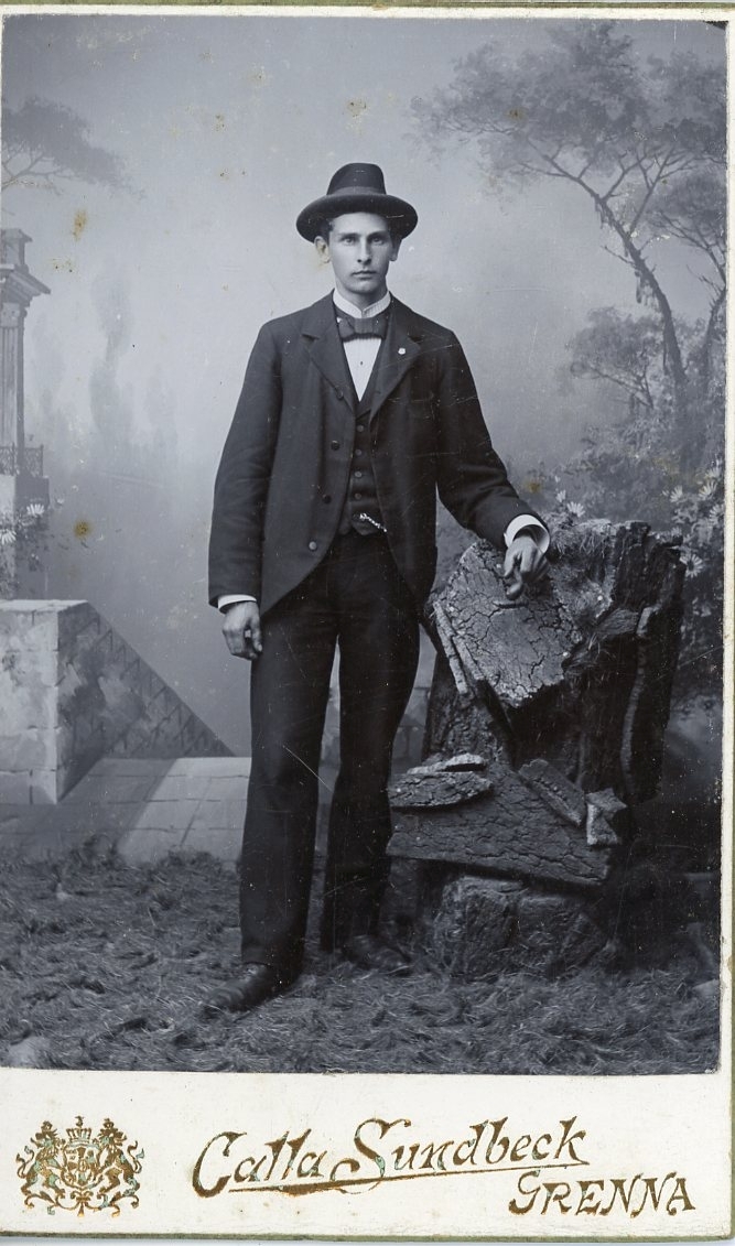 Kabinettsfotografi av en ung man med hatt på huvudet.