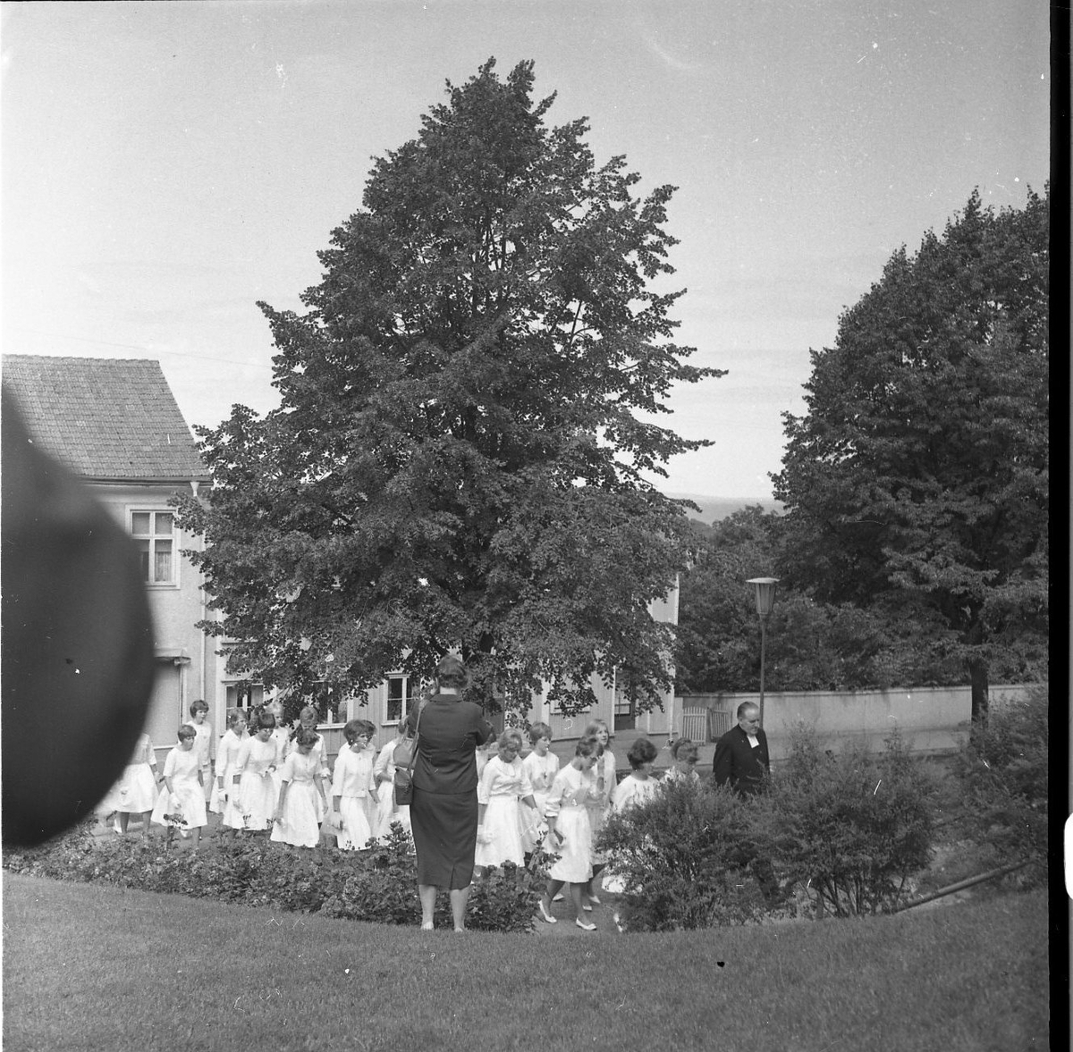 Ett tåg med konfirmander går upp för trappen till Gränna kyrka. Kyrkoherde Wallis Wendel leder dem.
