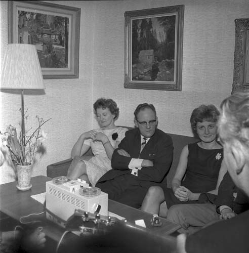 Kvinnor och män sitter i en soffa vid ett bord. Framför dem på bordet står en bandspelare.