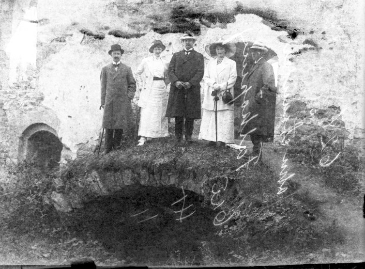 Tre män och två kvinnor står på ett valv på inre borggården till Visingsborgs slottsruin. Kvinnorna i ljust och den ena med stor hatt.