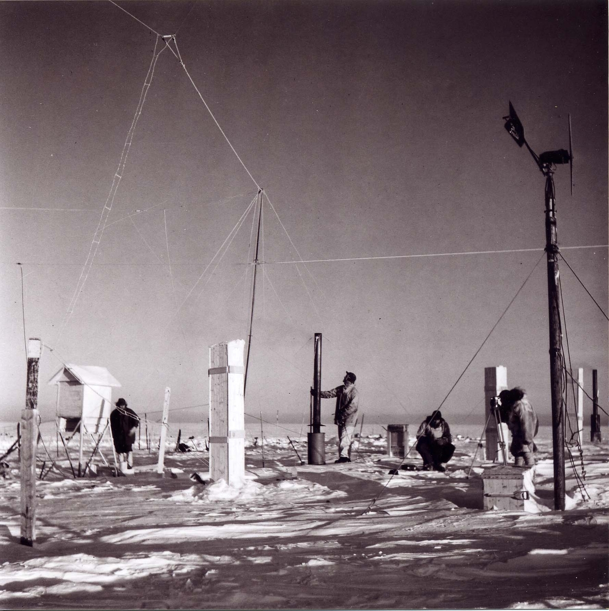 "Förlängning av skorstenarna för att få ordning på ventilationen på Maudheim. Bilden tagen 7 augusti 1951. Gösta Liljequist vid meteorolburen, Valter [Schytt] vid skorstenen mitt i bild."