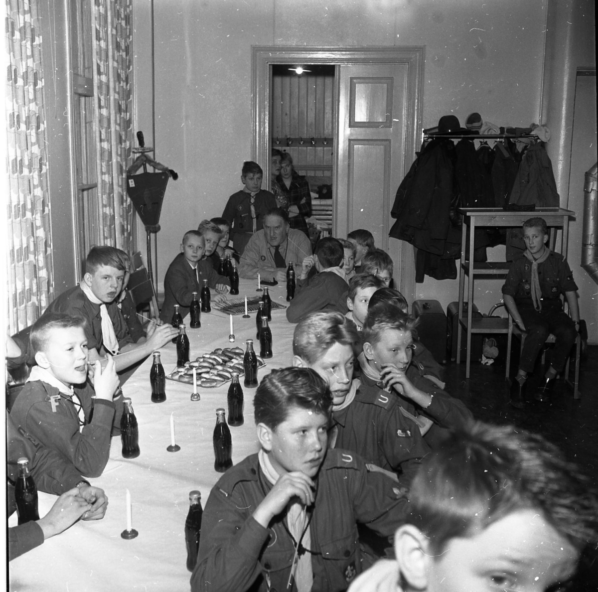 Ungdomar sitter runt ett bord. De är vända ifrån bordet och tittar på något utanför bild. På kortändan sitter en scoutledare. De har varsin glasflaska med läsk framför sig.